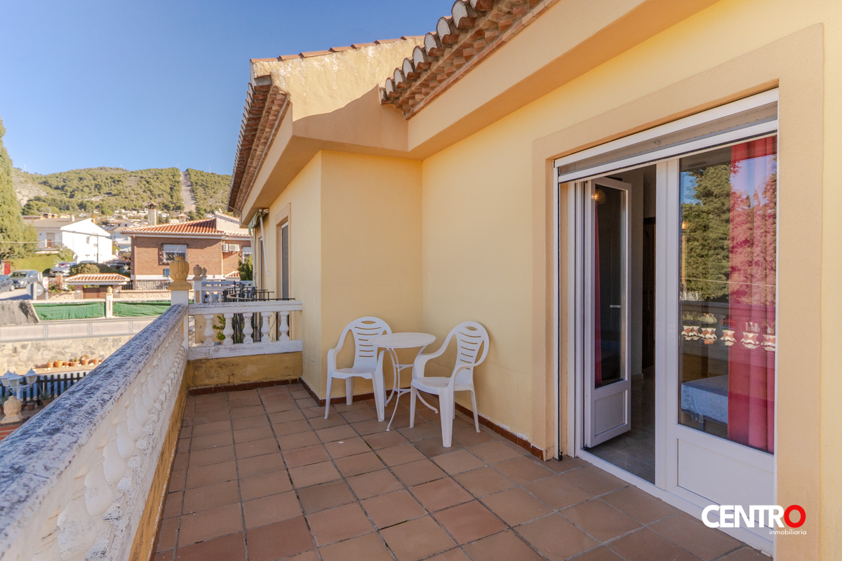 El exterior de la casa es igualmente impresionante, con una amplia terraza adornada con baldosas decorativas que se extiende hacia una refrescante piscina, ideal para disfrutar de los días soleados. Además, la propiedad cuenta con un balcón con zona de estar, perfecto para disfrutar de las vistas y el clima mediterráneo. La seguridad no es un problema, ya que la entrada está protegida por una puerta de acceso segura.